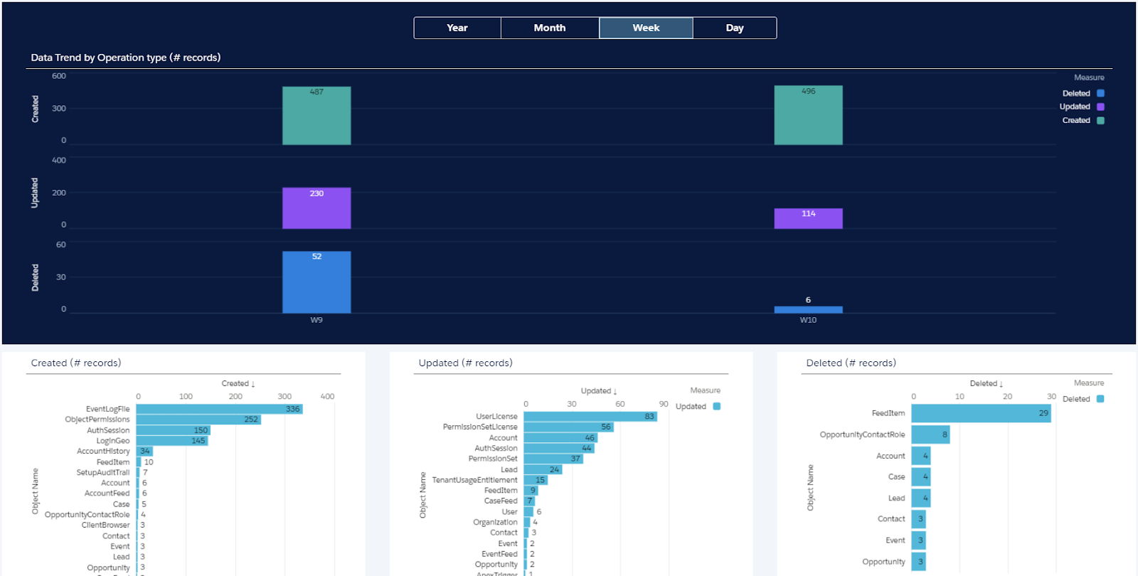Advanced Analytics gives you the tools to help identify activity in your org with the Odaseva Monitoring dashboards. For example you can create alerts that notify of a sharp increase in data activity and drill down into every object to see what was created, updated, or deleted.
