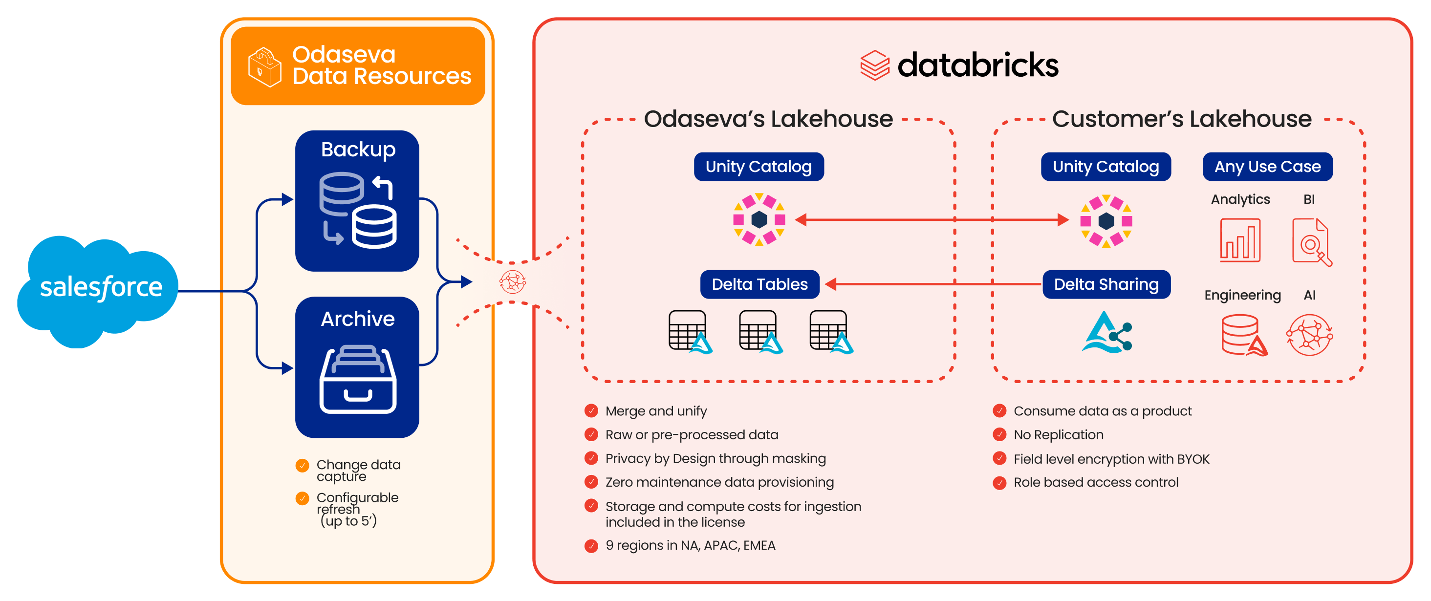 Performance bottlenecks in Salesforce integration usually occur at the extraction layer. Odaseva decouples extraction from consumption by preparing data in a secure, Delta-optimized vault first. Our architecture is engineered to outperform standard Salesforce API extraction limits by orders of magnitude, ensuring that even for Orgs with billions of records, your AI models and analytics dashboards never choke on data growth or physical movement latency.