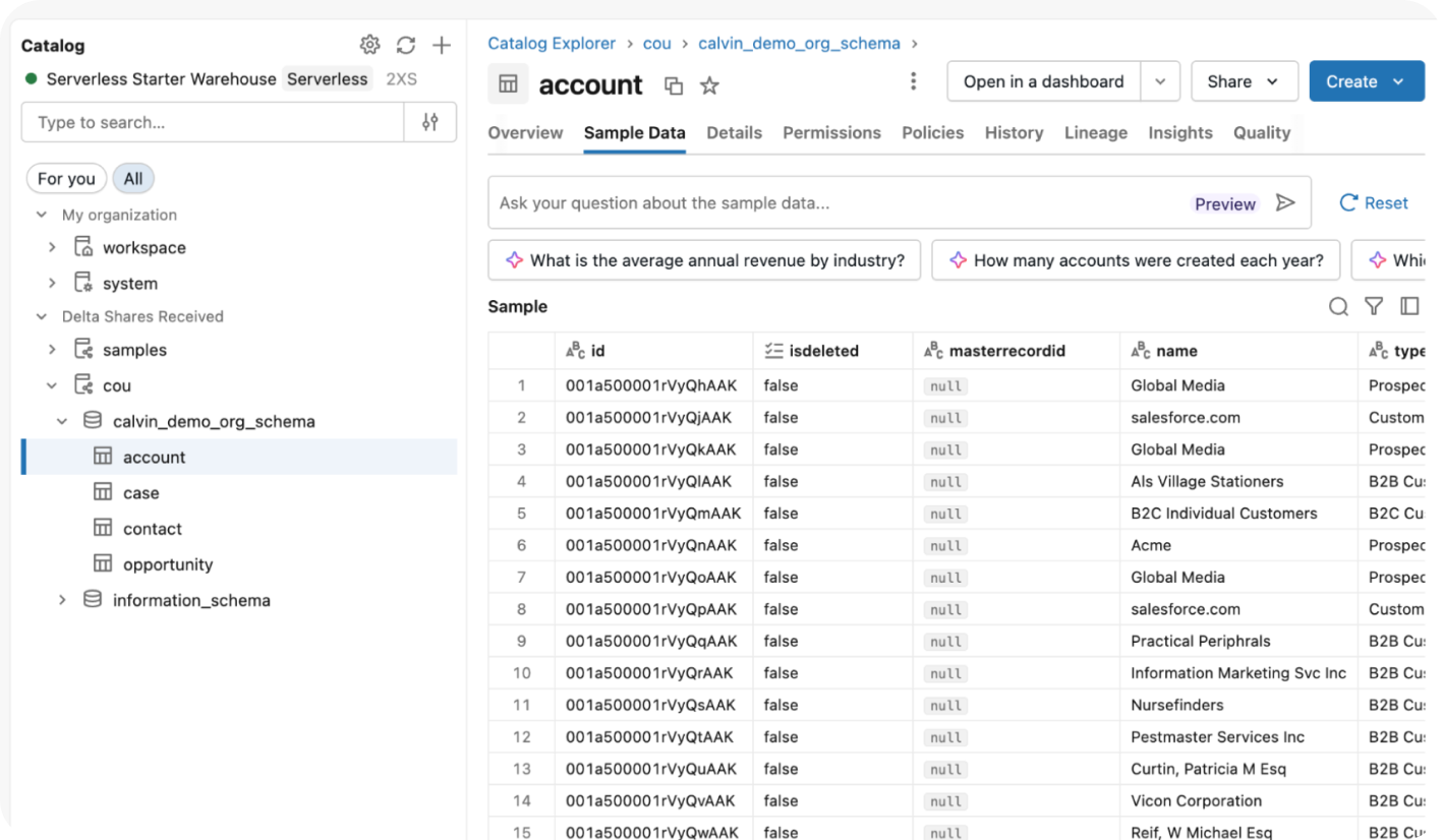 The process is manifest-driven and utilizes the open Delta Sharing protocol. We ingest your secure Salesforce backups, convert them into optimized Delta Lake tables, and register them in your Unity Catalog as a Foreign Catalog. These "foreign tables" can be directly queried by Spark or Photon, consumed by Mosaic AI and autonomous agents, or used as the landing zone bronze layer within a larger Medallion Architecture—all without the latency or cost of Salesforce to Databricks physical data movement.